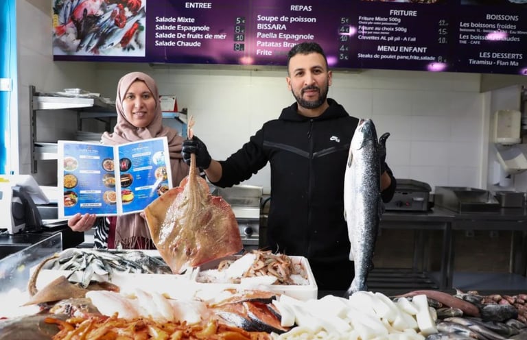 Prise à l’intérieur du resto-poisson, cette image montre les propriétaires de l’établissement, Abdulilah Iffoudin avec sa femme Leila, leur marchandise, le menu proposé à la dégustation et les prix des différents plats disponibles.