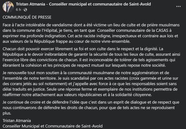 Ces faits d'une rare violence symbolique ont suscité l’indignation d’élus locaux, dont Tristan Atmania, conseiller municipal, qui a publié un communiqué dénonçant fermement cet acte.