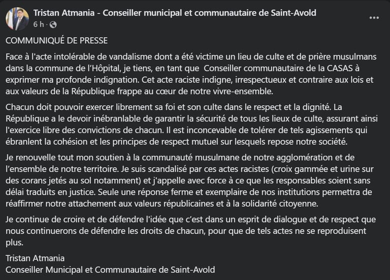 L’élu évoque un « acte raciste indigne, irrespectueux et contraire aux lois et aux valeurs de la République », insistant sur l’impératif républicain de garantir la liberté de culte dans le respect et la sécurité. Il a également exprimé son soutien à la communauté musulmane locale et à l’ensemble des fidèles touchés par cette profanation.