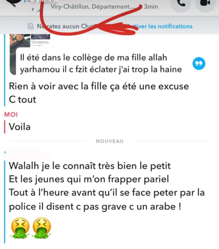 L'un des témoins a également affirmé sur le réseau social Snapchat, le 5 Avril 2024, avoir entendu les suspects déclarer "C'est pas grave c'est un Arabe"