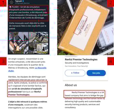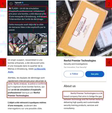 Bien qu'il soit impossible d'affirmer avec certitude un lien direct avec le réseau en question, les premiers éléments laissent à penser qu'un membre de ce groupe pourrait avoir agi en France. En effet, le même jour, des engins explosifs factices exclusivement destinés aux professionnels ont été déposés devant des mosquées à Londres et à Strasbourg.