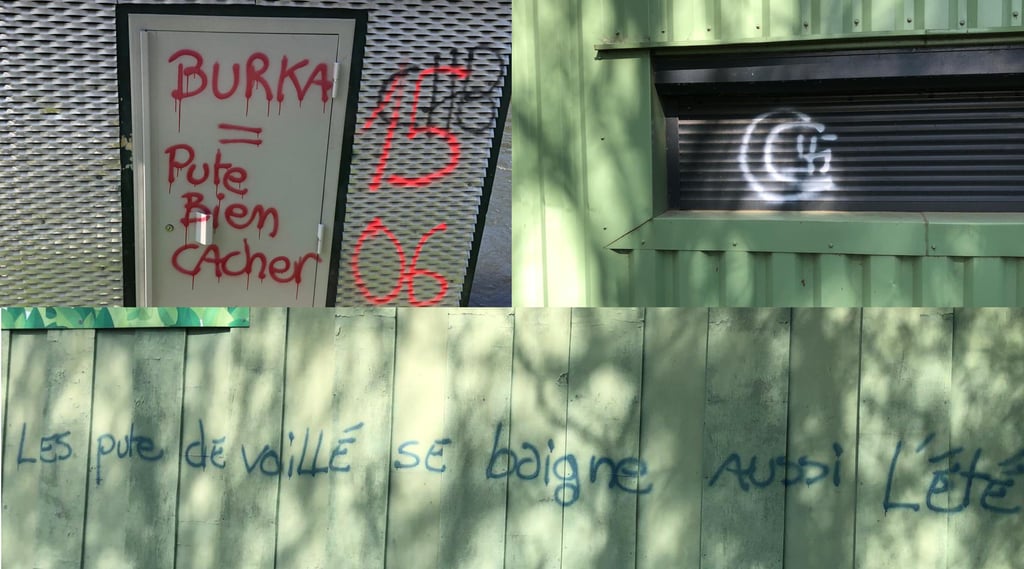 Parmi eux : « Les putes voilées se baignent aussi l’été », des croissants musulmans accompagnés d’une croix gammée, ainsi que « Burka = pute bien cachée ». Ces inscriptions constituent une manifestation directe de la haine raciale et religieuse ciblant la communauté musulmane.