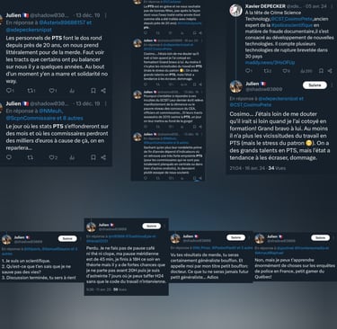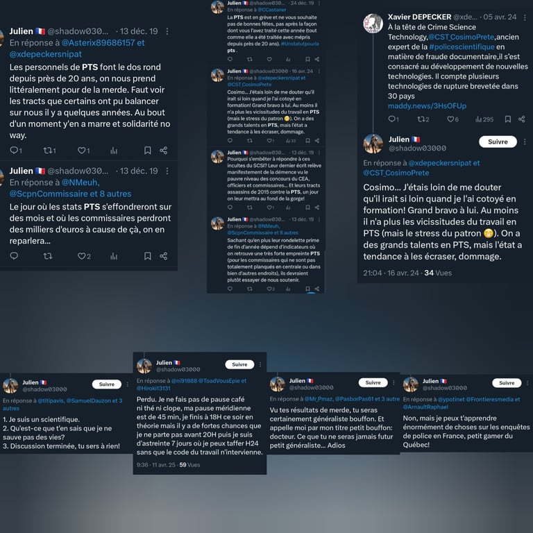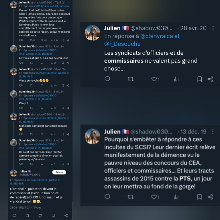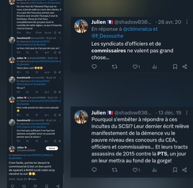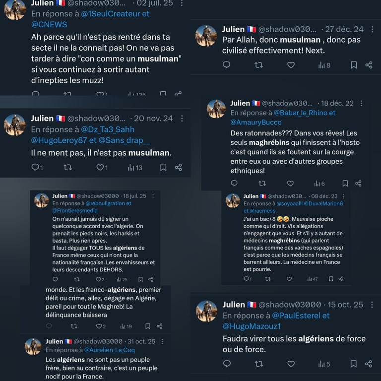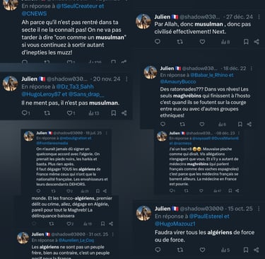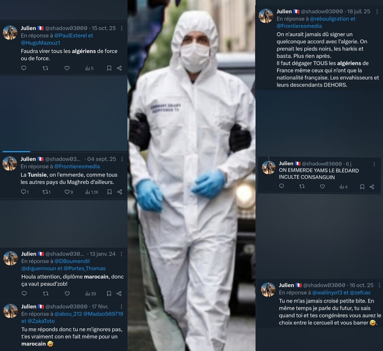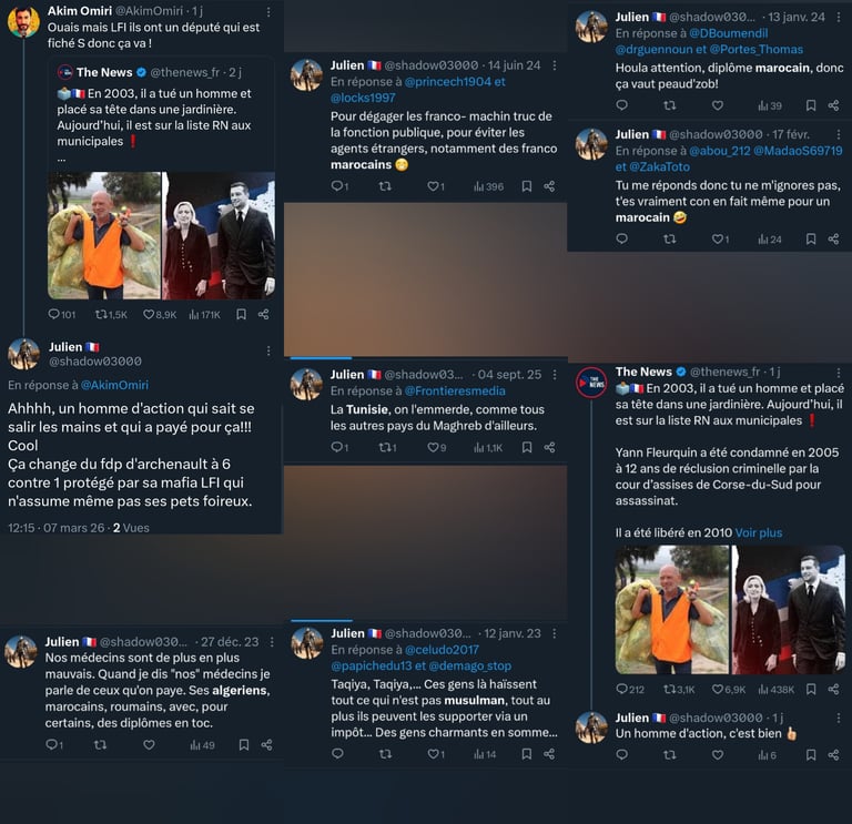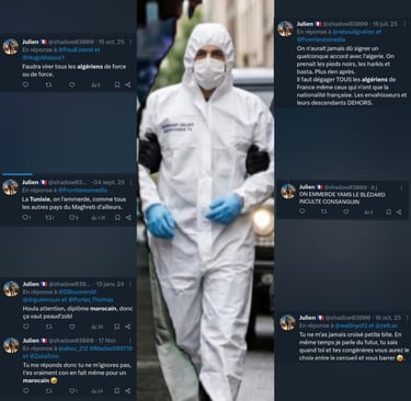 La lecture de ses publications sur X dévoile une obsession destructrice envers les populations maghrébines, systématiquement rabaissées à un stade animal ou pathologique. Julien Thion, le responsable de l'équipe de la police technique et scientifique (PTS) de Moulins, n'hésite pas à traiter ses contradicteurs de "blédard", "inculte consanguin" ou à s'interroger publiquement si "leur arbre généalogique ne comporte pas quelques animaux bizarres".