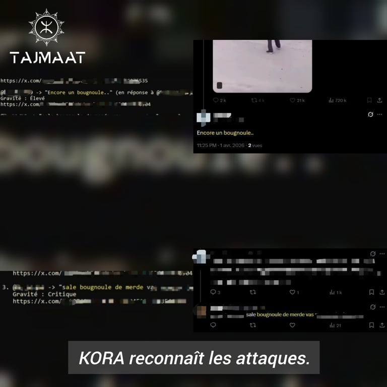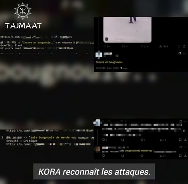 KORA est l'agent IA de la V3 d'OMROS, la plateforme de signalement de Tajmaât : il détecte, analyse et signale automatiquement les actes visant la communauté maghrébine sur les réseaux sociaux.