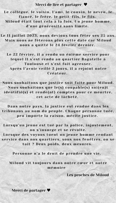 Le 22 février, Miloud, 24 ans, a été battu à mort dans le quartier de Bagatelle à Toulouse. Il aurait dû fêter ses 25 ans hier, le 11 juillet. Ses proches lui rendent hommage et réclament justice.