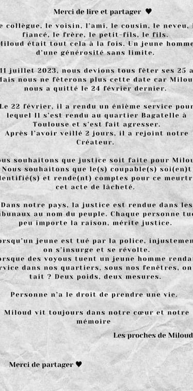 Meurtre de Miloud à Toulouse. Ses proches souhaitent la fin de l'Omerta.