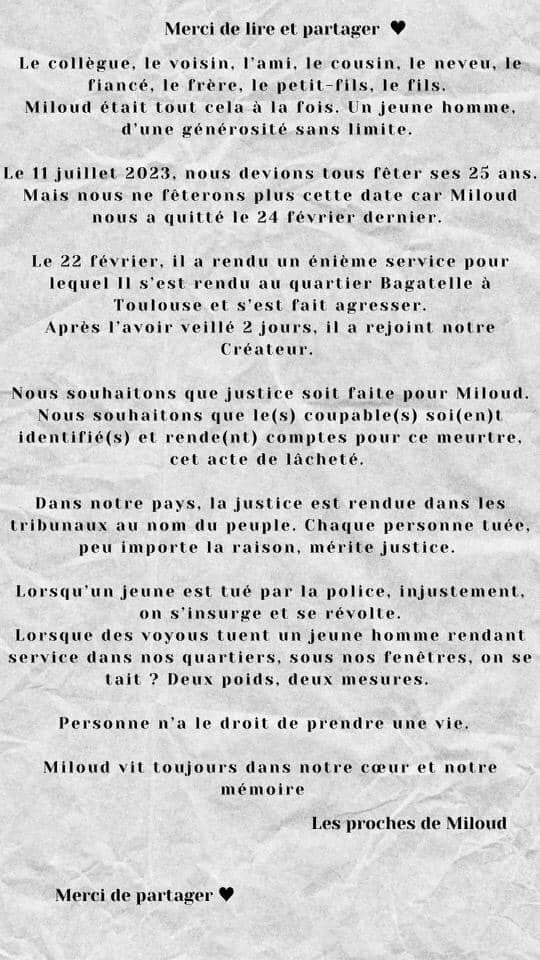 Le journal « La Depeche » rapporte que ce mardi 11 juillet 2023, Miloud aurait dû fêter ses 25 ans entouré de ses proches. « Nous ne fêterons plus cette date car Miloud nous a quittés le 24 février dernier », pleurent-ils. « C’était un garçon très serviable et c’est ce qui l’a mené à son décès », analyse son papa.