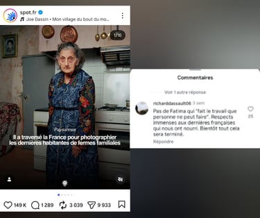 Sous une publication Instagram du média Spot.fr consacrée aux fermières françaises très âgées, un internaute a posté un commentaire raciste visant les mères de famille d’origine maghrébine, qualifiées de « fatimas », et insinuant qu’elles ne feraient pas « le travail que personne ne veut faire ».