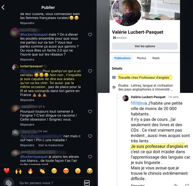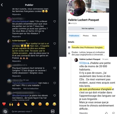 À la surprise de nombreux internautes, Valérie Lucbert Pasquet, qui se présente comme professeur d’anglais dans un collège, a non seulement approuvé ce commentaire mais l’a aggravé.
