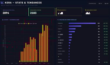 À titre d'exemple, nous ne demanderons pas de comparaison sur des affaires à l'échelle locale, régionale, et encore moins nationale, nous savons d'avance que le résultat serait sans appel. Nous n'évoquerons pas non plus l'ensemble de nos services, car le niveau d'exigence serait trop élevé pour eux pour servir de référence utile. Voici donc simplement un aperçu partiel de KORA, uniquement la composante dédiée à X, les autres réseaux sociaux étant volontairement omis afin de simplifier la comparaison. KORA est encore en phase de test. Elle n'est pas pleinement opérationnelle, ce le sera fin 2026. Malgré ces limitations, en seulement trois semaines d'activité partielle, KORA a recensé près de 3 000 actes sur cette seule plateforme.
