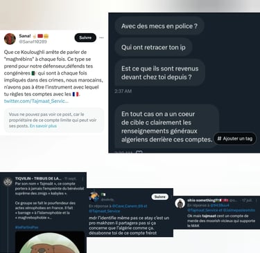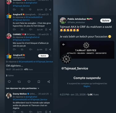 Depuis notre création, Tajmaât Service est dans le viseur de multiples groupuscules : islamophobes, néonazis, sionistes, mouvements anti-maghrébins en tout genre. Nous avions anticipé ces attaques. Nous les avons encaissées, sans jamais fléchir.