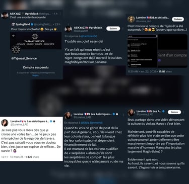Des internautes racistes anti-maghrébins réagissant positivement à la suspension du compte, avec, en regard, leurs propres propos tenus antérieurement. La démonstration est sans appel : leurs nouveaux alliés ont seulement une haine commune.