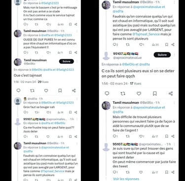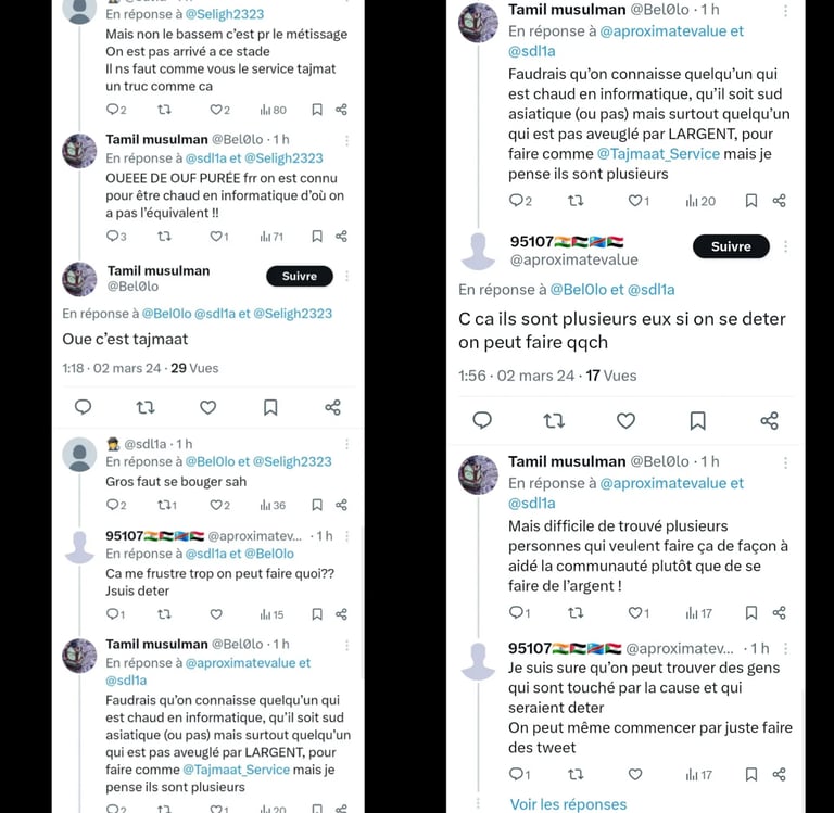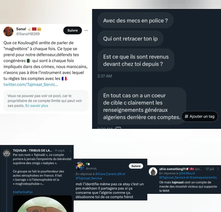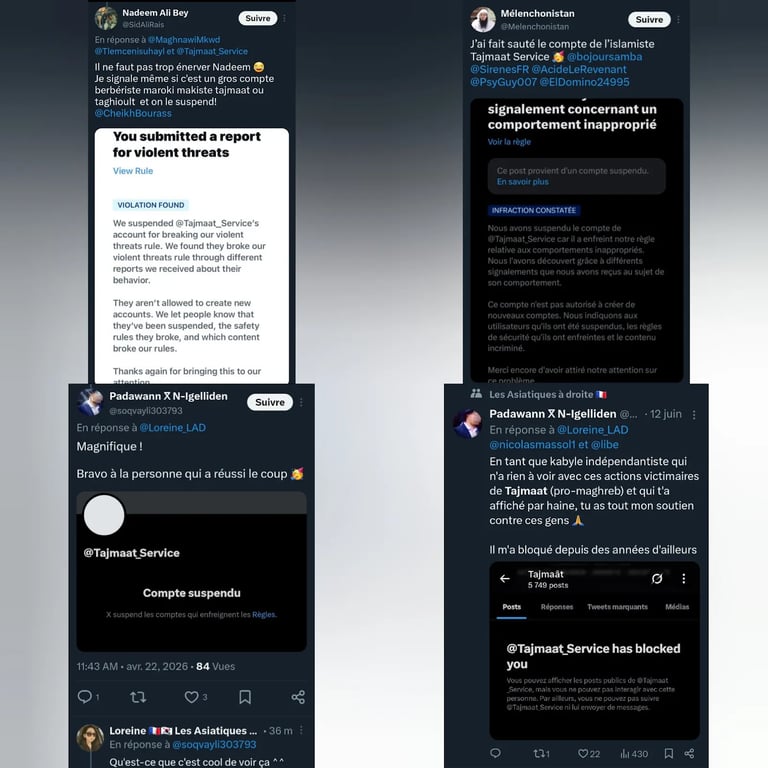 Pendant toutes ces années, ces groupuscules n'ont jamais utilisé OMROS pour signaler des liens, jamais envoyé un email, jamais contacté en message privé pour alerter sur une affaire. Le schéma était systématiquement identique : ils nous mentionnaient publiquement, au milieu d'insultes, en exigeant une réaction immédiate, tout en nous traitant de « sales bounifs » et « sales bousbir ».