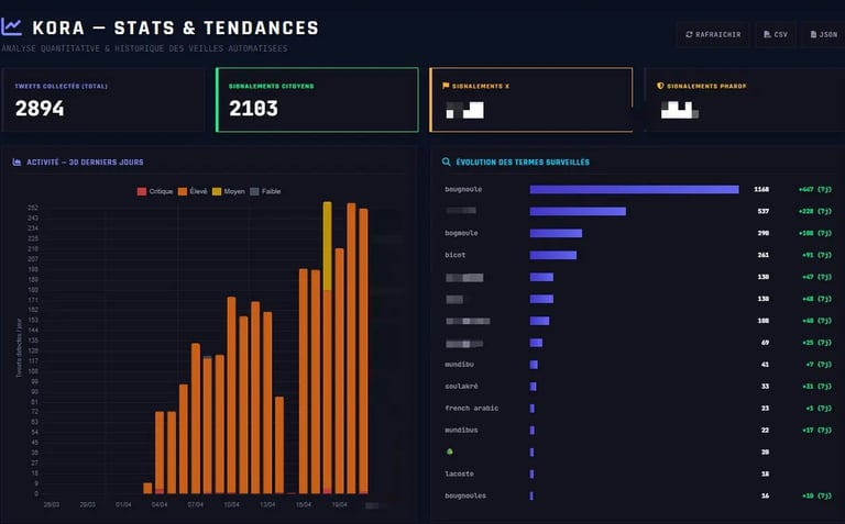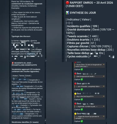 Petite parenthèse, tôt ou tard, des attentats viseront les Maghrébins et les Musulmans. Ce n'est plus une hypothèse, nos données indiquent une hausse significative et documentée de la haine envers ces communautés. La question n'est plus de savoir si cela arrivera, mais quand. C'est précisément l'une des raisons pour lesquelles KORA a été développée : analyser des milliers de données, identifier des patterns comportementaux et détecter en amont les signaux faibles pouvant alerter d'une agression ou d'un attentat imminent.