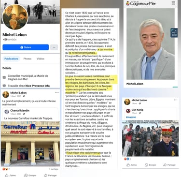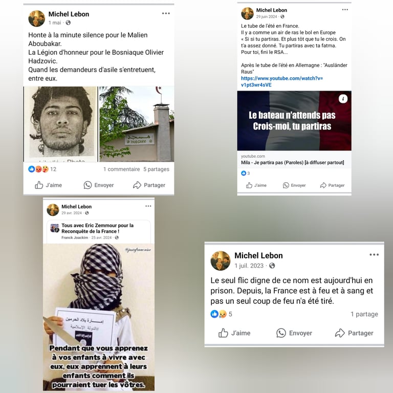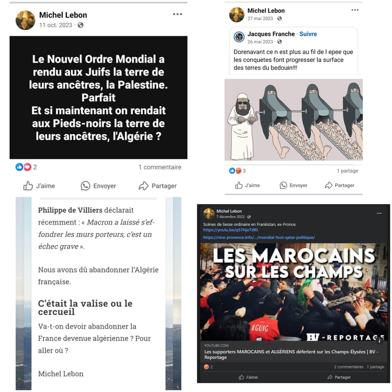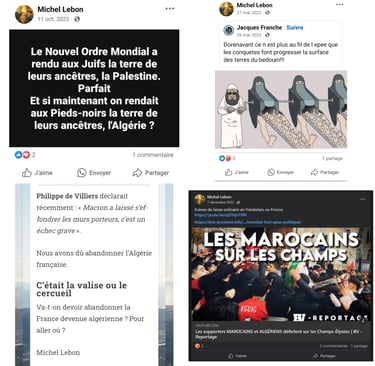 Sur ses réseaux sociaux personnels, Michel LEBON, un nostalgique de "l'Algérie Française" a publié à plusieurs reprises des contenus incitant à la haine raciale, notamment à l’encontre des communautés maghrébines et musulmanes.