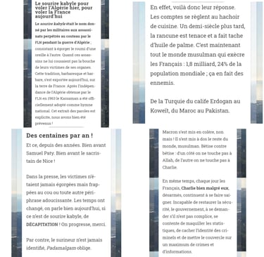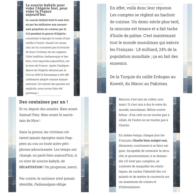 Il évoque également une prétendue stratégie des Maghrébins fondée sur le « sourire kabyle », une méthode d’exécution utilisée par les moudjahidin durant la guerre d’Algérie contre les troupes coloniales françaises, qu’il accuse aujourd’hui d’être réactivée symboliquement pour égorger des citoyens et ainsi « voler la France », qui serait « détestée par 1,8 milliards de musulmans [...] des ennemis. »
