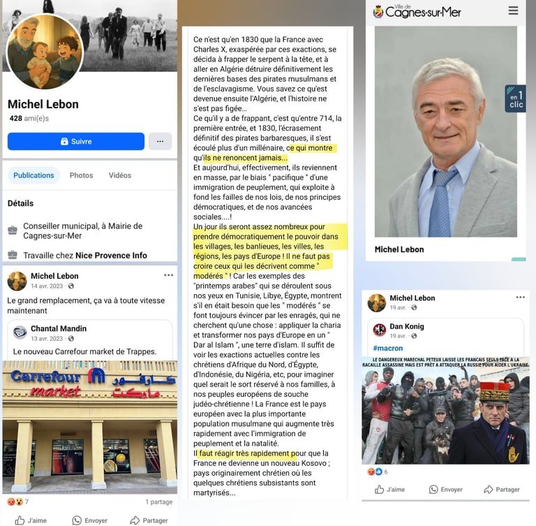 Le comportement en ligne de Michel LEBON, conseiller municipal à Cagnes-sur-Mer, suscite une vive inquiétude après la découverte d’une série de publications aux propos ouvertement racistes, anti-maghrébins, islamophobes et conspirationnistes. Des éléments concrets mettent en lumière une dérive idéologique persistante et incompatible avec les responsabilités d’un élu local.